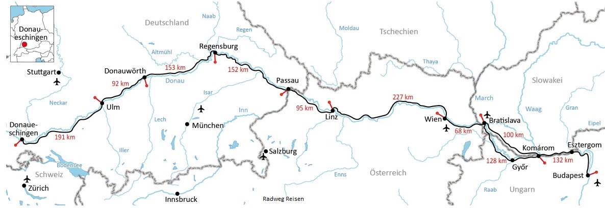 Im Folgenden finden Sie eine Übersicht der möglichen Etappenlängen am Donauradweg: