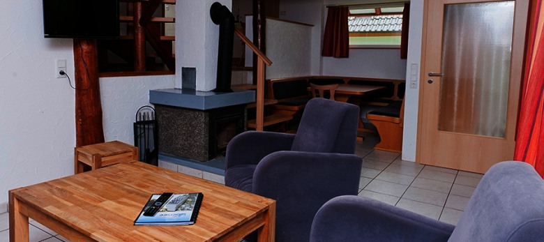 8‑Bett‑Ferienhaus „Silbersee“ oder 6‑Bett‑Ferienhaus „Rotkäppchen“: Erdgeschoss bzw. Zwischengeschoss mit Diele, Wohnraum, Essecke, teilweise Kamin, Terrasse, Küche, Bad / WC; Obergeschoss mit zwei Schlafräumen und Balkon. Im 8‑Bett‑Haus zusätzlich zwei Schlafzimmer.